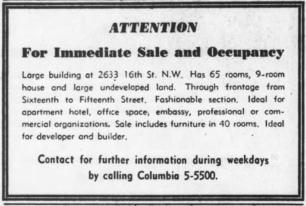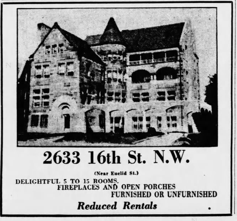 In December 1925, five apartments were advertised for rental. Three “de Luxe” apartments comprising either 12 or 15 rooms, and two small apartments. Each of the deluxe apartments occupied an entire floor. Totten’s intentions were to rent the large luxury apartments to politicians, diplomats and government dignitaries, pointing out in newspaper advertisements that the building’s location was in “the center of the diplomatic section.”