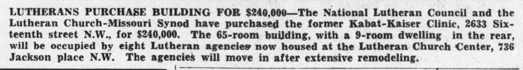 After 20 years, the National Lutheran Council sold the property to the newly established Antioch School of Law. By the time the school took ownership of the buildings, the interior of the Warder Mansion building scarcely resembled the original layout, as many of the original architectural details had been altered, removed, or spoiled in some manner. Further renovations by the school to upgrade electrical systems, modernize heating and air conditioning systems, and improve the general layout for school use further altered the interior of the buildings.